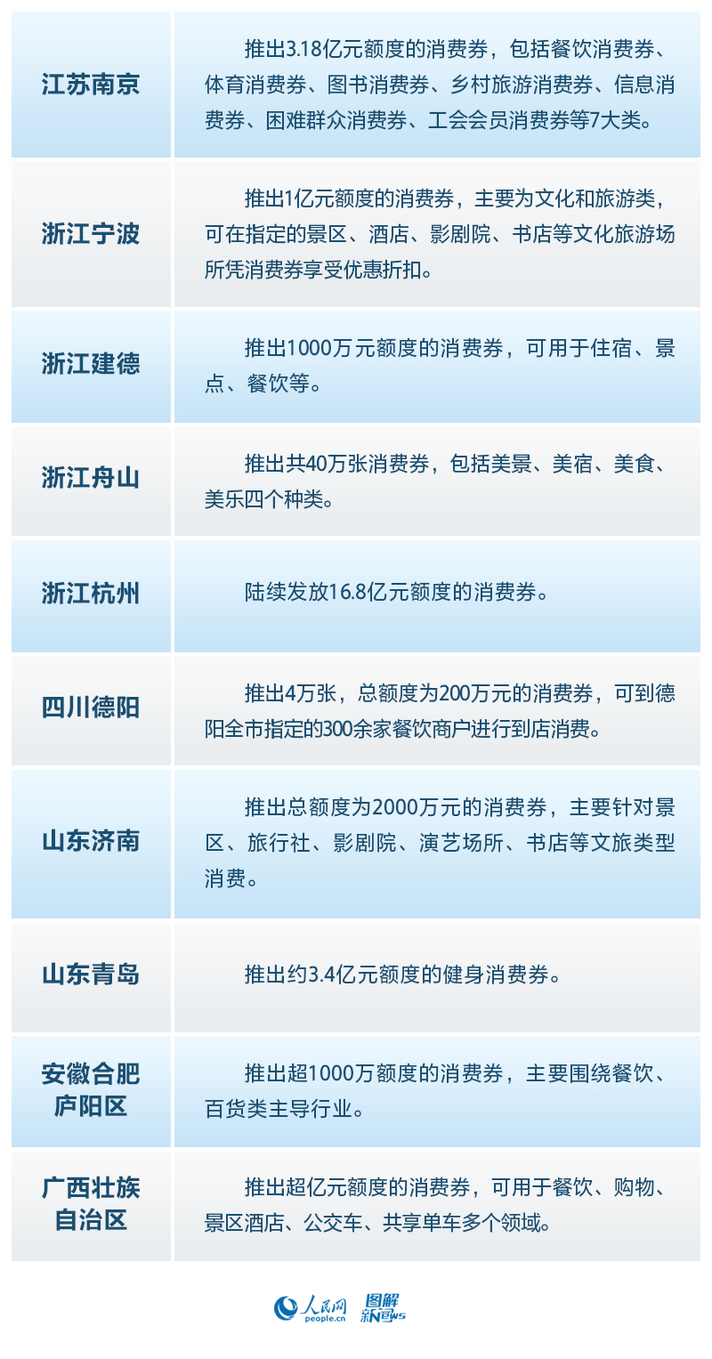 近期,南京、寧波、濟(jì)南等地紛紛推出消費(fèi)券,額度從幾百萬(wàn)元至上億元不等,涉及餐飲、住宿、健身、文化等多個(gè)領(lǐng)域。據(jù)了解,南京發(fā)放消費(fèi)券在5天內(nèi)帶動(dòng)近千萬(wàn)元消費(fèi),杭州發(fā)放第一批消費(fèi)券即拉動(dòng)消費(fèi)4.53億。目前,多省市已推出或計(jì)劃推出消費(fèi)券。