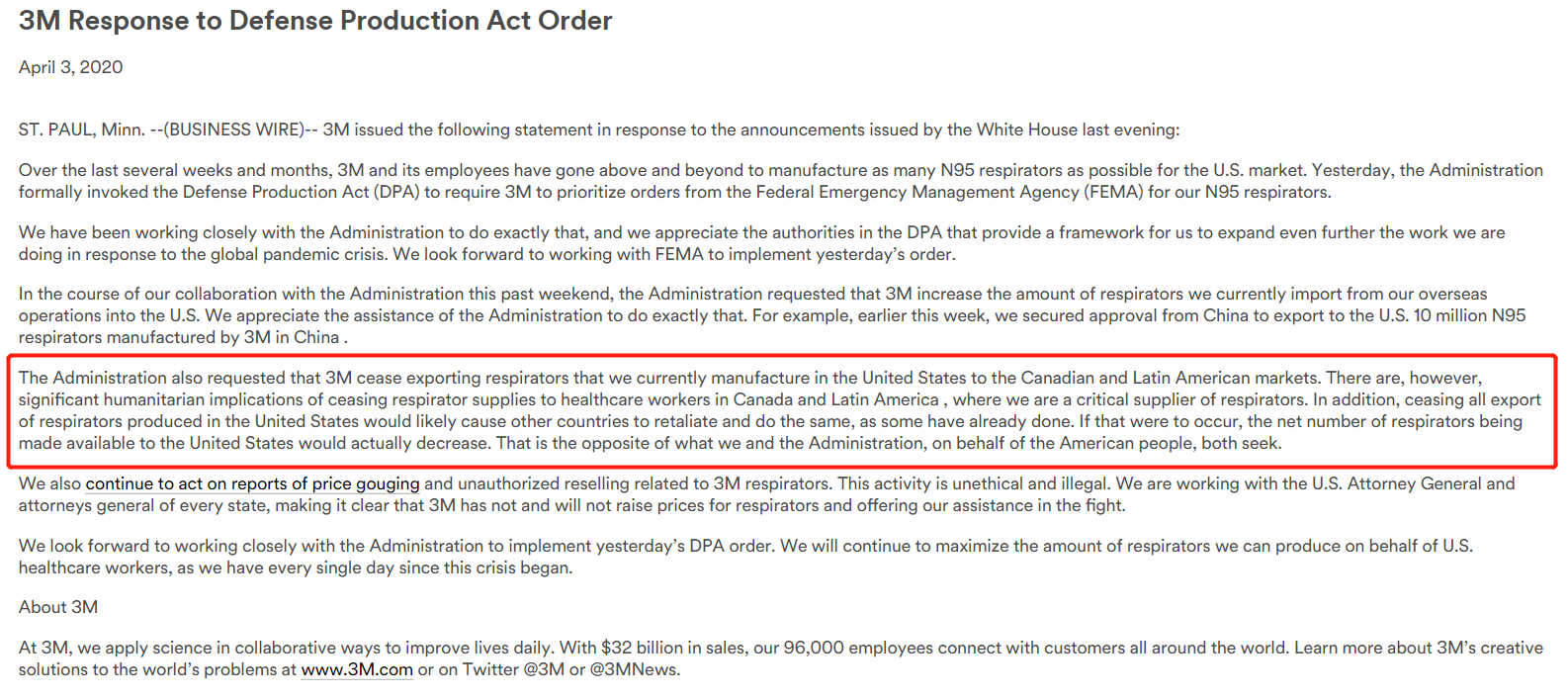 聲明指出,3M是加拿大和拉美國(guó)家極為重要的口罩供應(yīng)商,此時(shí)切斷對(duì)這些國(guó)家醫(yī)護(hù)人員的口罩供應(yīng),會(huì)產(chǎn)生嚴(yán)重的“人道后果”。這種做法也可能引起其他國(guó)家的報(bào)復(fù)和仿效,反過(guò)來(lái)影響美國(guó)本土的口罩和其他醫(yī)用產(chǎn)品的供應(yīng)。