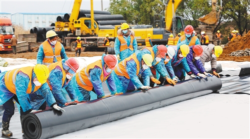 中建三局火神山醫(yī)院建設者在施工現(xiàn)場鋪設“兩布一膜”防護層。 (資料照片)