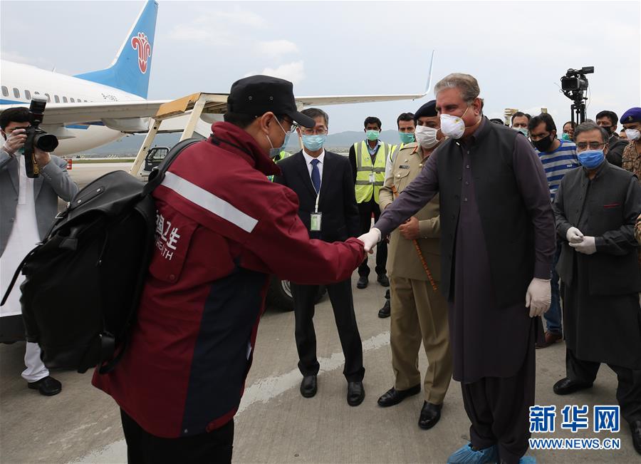 3月28日,在巴基斯坦伊斯蘭堡國際機(jī)場,巴基斯坦外長庫雷希(前右)與剛剛抵達(dá)的中國政府赴巴基斯坦抗疫醫(yī)療專家組成員握手。 新冠肺炎疫情發(fā)生以來,習(xí)近平主席時(shí)刻關(guān)注國內(nèi)外疫情形勢,高度重視抗疫國際合作,多次作出重要指示批示,頻頻開展元首外交,從構(gòu)建人類命運(yùn)共同體高度,親自推動(dòng)疫情防控國際合作。 新華社記者 劉天 攝