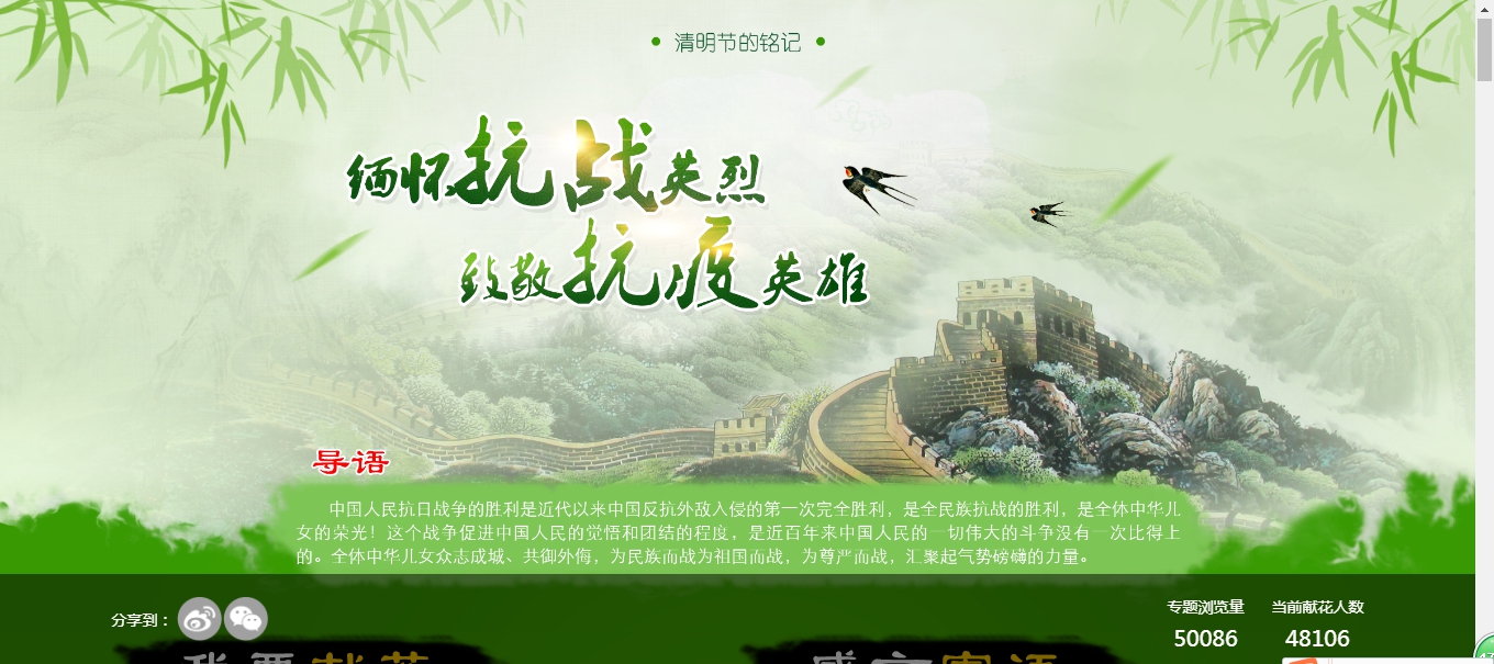 4月3日,北京民俗博物館通過線上發(fā)布《抗擊疫情 攜手同行》抗疫視頻,向觀眾介紹博物館抗擊疫情的相關工作情況,同時通過宣傳清明傳統(tǒng)習俗知識,倡導清明緬懷英烈、綠色祭掃。中國人民抗日戰(zhàn)爭紀念館啟動“清明節(jié)的銘記——緬懷抗戰(zhàn)英烈 致敬抗疫英雄”主題教育系列活動,包括清明專場云直播、線上研學、京冀互動“雄安人民的驕傲”等,其中清明專場云直播共計有6.1萬名觀眾參與?箲(zhàn)館還在官網(wǎng)推出“緬懷抗戰(zhàn)英烈 致敬抗疫英雄”清明節(jié)特別專題頁面,展示抗戰(zhàn)英烈名錄、英烈故事、英烈家書、抗疫英雄視頻、抗疫詩歌及抗戰(zhàn)館清明節(jié)相關活動,呼吁大家通過“云獻花”、網(wǎng)上留言等方式參與“云祭掃”。4月2日至4月6日10時,專題頁面瀏覽量、獻花人數(shù)分別為4.8萬、4.6萬。