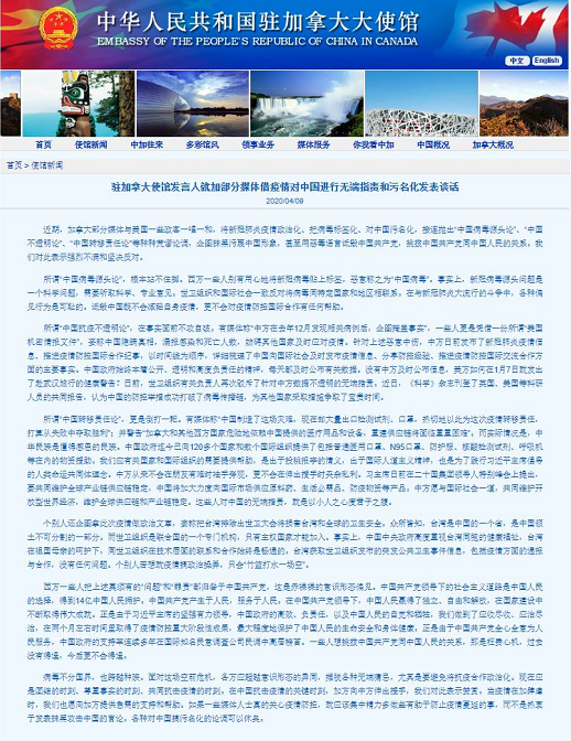 駐加拿大使館發(fā)言人就加部分媒體借疫情對中國進行無端指責和污名化發(fā)表談話