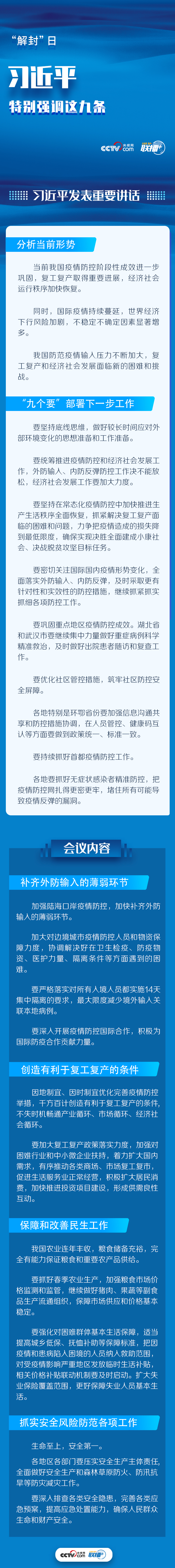 如今,武漢已經(jīng)“解封”,但“解封”不等于“解防”, “開(kāi)城門(mén)”不等于“開(kāi)家門(mén)”。我國(guó)疫情防控階段性成效進(jìn)一步鞏固,但國(guó)際疫情持續(xù)蔓延,世界經(jīng)濟(jì)下行風(fēng)險(xiǎn)加劇,如何在落實(shí)常態(tài)化疫情防控舉措的同時(shí),全面推進(jìn)復(fù)工復(fù)產(chǎn)工作,央視網(wǎng)《聯(lián)播+》梳理會(huì)議要點(diǎn),與您一起學(xué)習(xí)。