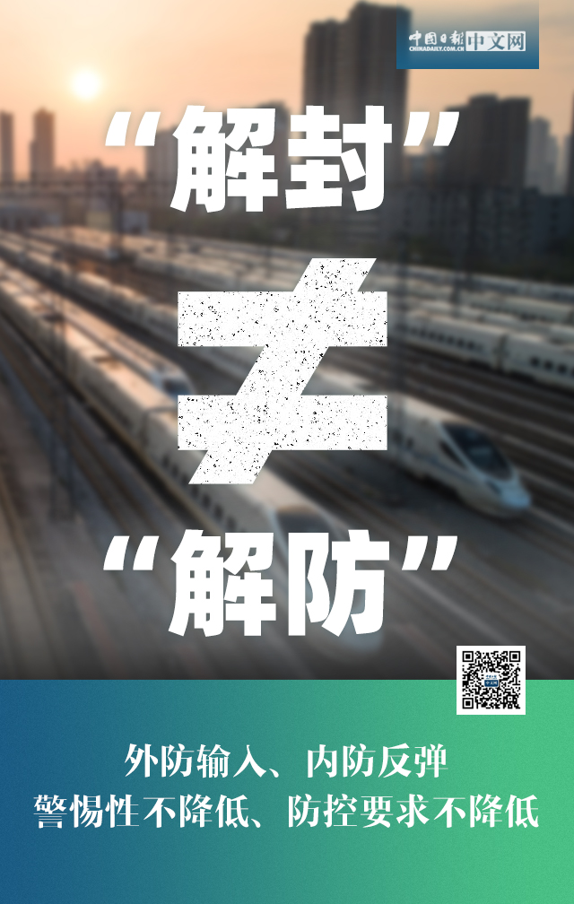 但“解封”不等于“解防”,打開城門不等于打開家門,零新增并不等于零風(fēng)險。目前疫情防控任務(wù)依然艱巨繁重,尤其境外疫情輸入壓力持續(xù)增大,我們不能盲目樂觀。疫情之下,讓我們繼續(xù)加強自我管理,不扎堆,不聚集,保持人員安全有序流動。
