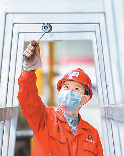 在湖北億鈞耀能新材股份公司車間,工人對生產(chǎn)線涂刷油漆除銹作業(yè)。
