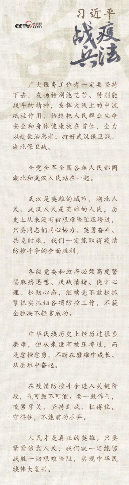 “戰(zhàn)勝這次疫情,給我們力量和信心的是中國人民。”“人民才是真正的英雄。只要緊緊依靠人民,我們就一定能夠戰(zhàn)勝一切艱難險阻,實現(xiàn)中華民族偉大復興。”