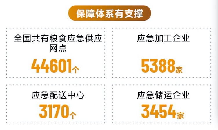 首先,保障體系有支撐,原糧儲備、成品糧儲備充足,一批應(yīng)急加工企業(yè)、應(yīng)急供應(yīng)網(wǎng)點、應(yīng)急配送中心和應(yīng)急儲運企業(yè)已建成;其次,市場波動有監(jiān)測,我國建立起兩級監(jiān)測體系,國家級糧食市場信息直報點1072個,地方糧食市場信息監(jiān)測點9206個;第三,應(yīng)對變化有預(yù)案:我國建立了從國家、省、市、縣四級的糧食應(yīng)急預(yù)案體系;第四,保供穩(wěn)市有責任:我國已建立并督促各地嚴格落實糧食安全省長責任制。