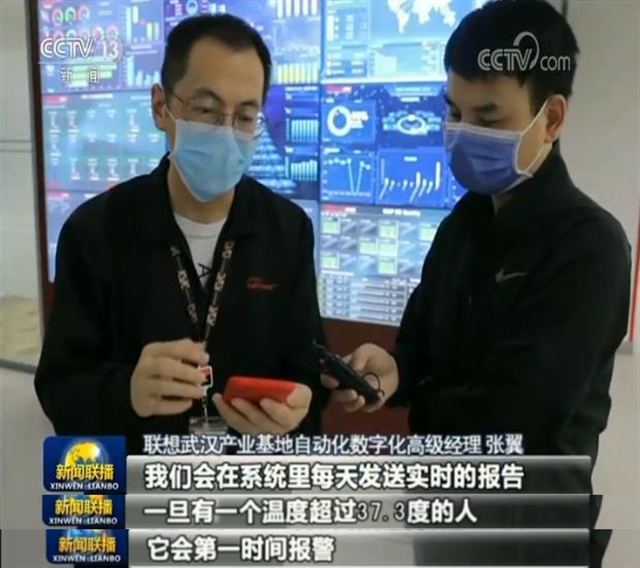 這里是聯(lián)想武漢產(chǎn)業(yè)基地,目前復(fù)工復(fù)產(chǎn)率已達(dá)到100%,所有返崗員工都需持有健康證明,在工作區(qū)域每隔4小時(shí)就有網(wǎng)格員來測量體溫。此外,企業(yè)還專門開發(fā)了數(shù)字化防疫系統(tǒng),對(duì)在崗員工健康狀況進(jìn)行精準(zhǔn)管理。