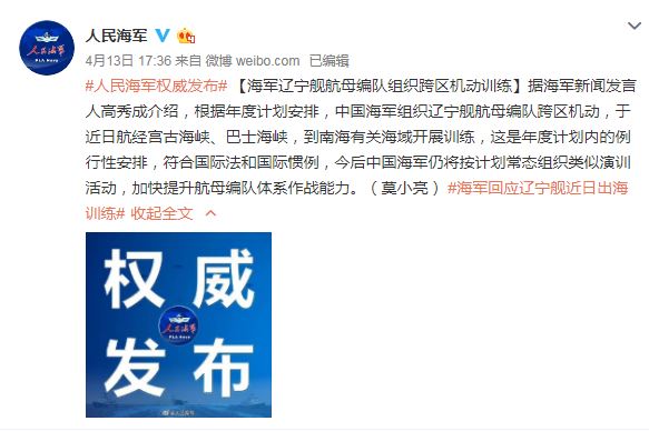 中國臺灣網(wǎng)4月14日北京訊 4月13日,據(jù)海軍新聞發(fā)言人高秀成介紹,根據(jù)年度計(jì)劃安排,中國海軍組織遼寧艦航母編隊(duì)跨區(qū)機(jī)動(dòng),于近日航經(jīng)宮古海峽、巴士海峽,到南海有關(guān)海域開展訓(xùn)練,這是年度計(jì)劃內(nèi)的例行性安排,符合國際法和國際慣例,今后中國海軍仍將按計(jì)劃常態(tài)組織類似演訓(xùn)活動(dòng),加快提升航母編隊(duì)體系作戰(zhàn)能力。(完)