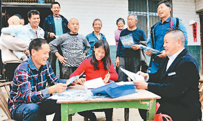 3月26日,湖北省十堰市鄖陽區(qū)白桑關(guān)鎮(zhèn)梅子營村村民尤爾霞(前中)在家門口領(lǐng)到了農(nóng)商行信貸員送來的10萬元貸款,計劃種植兩個大棚食用菌。