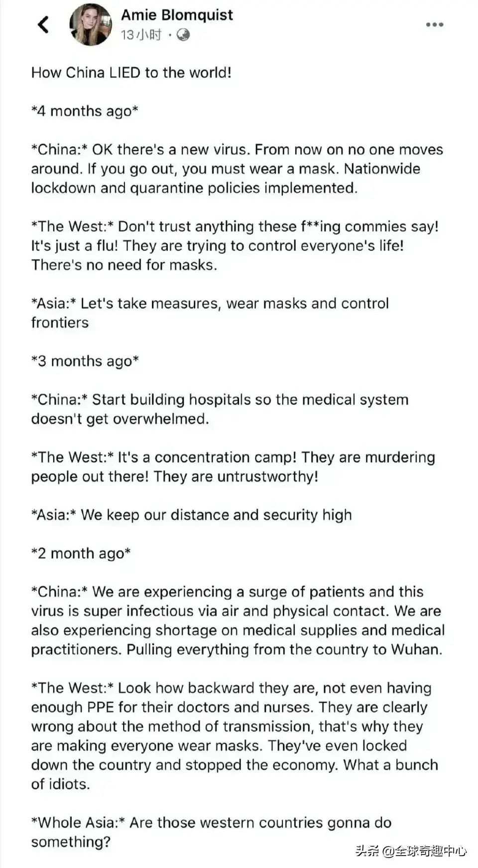歐美:看看他們是多么落后,甚至沒有足夠的個人防護(hù)用品給他們的醫(yī)生和護(hù)士,所以他們讓每個人戴口罩,甚至封鎖了整個國家,停止了經(jīng)濟運行,這明顯是錯誤的舉動,一群傻子。