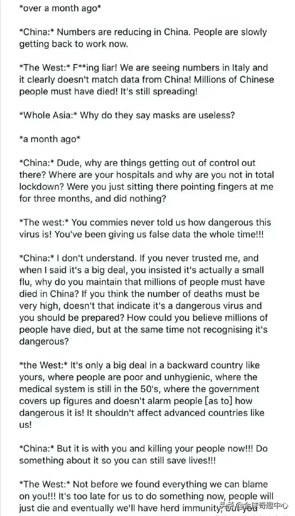 中國:哥們,發(fā)生了什么,疫情怎么失控了?醫(yī)院呢?為什么你不采取隔離措施,只是坐在那里指責(zé)了我三個月,什么也不做?