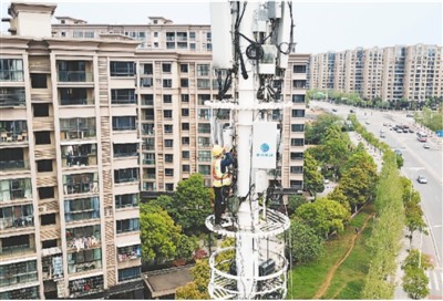 4月8日,106個“新基建”項目在湖南省長沙市天心區(qū)集中開工,這些項目涵蓋5G基建、大數(shù)據(jù)、人工智能等領(lǐng)域,總投資近30億元。圖為工作人員進行5G基站施工。