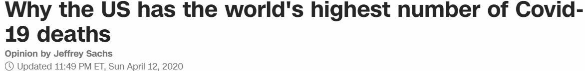 當(dāng)?shù)貢r(shí)間4月12日,美國主流媒體CNN發(fā)表哥倫比亞大學(xué)著名經(jīng)濟(jì)學(xué)教授杰佛瑞·薩科斯的評(píng)論文章《為何美國Covid-19死亡人數(shù)居世界首位》,認(rèn)為如果特朗普政府再不拿出一個(gè)完整、連貫的應(yīng)對(duì)方案,美國將會(huì)“繼續(xù)出現(xiàn)大量死亡”;而且,美國對(duì)中國和對(duì)世衛(wèi)組織的攻擊,完全是為了“轉(zhuǎn)移目標(biāo)”。