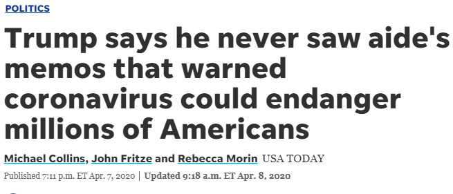 薩科斯教授在文中指出,近日的多家媒體報(bào)道都表明,美國早在今年初便收到了來自各方的疫情警告——美國情報(bào)機(jī)構(gòu)1月初就發(fā)出了警告,中國疾控中心主任1月3日也親自致電美國疾控中心主任發(fā)出了警告,特朗普白宮顧問彼得·納瓦羅1月28日同樣向總統(tǒng)提交了緊急備忘錄。然而三個(gè)月過去了,如今面對(duì)媒體疑問,特朗普卻表示“我從來沒見過這些報(bào)告和備忘錄”。 薩科斯教授不無諷刺地寫道:“在這點(diǎn)上,我相信特朗普。除了集會(huì)、真人秀電視發(fā)布會(huì),還有高爾夫球賽,特朗普都是缺席總統(tǒng)。”
