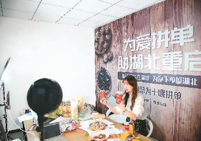 4月10日,在中國(guó)石化易捷開展的我們“易”起支援湖北公益直播活動(dòng)中主持人在介紹當(dāng)?shù)剞r(nóng)產(chǎn)品。