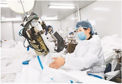 淮安經(jīng)濟(jì)技術(shù)開發(fā)區(qū)內(nèi),企業(yè)工人在生產(chǎn)防護(hù)服。