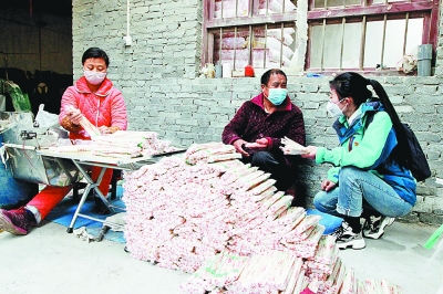 ①河南博愛縣月山鎮(zhèn)皂角樹村第一書記賀穎穎(右一)在村里的一次性筷子廠了解貧困戶近況。程全攝