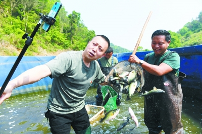 、诮饕舜菏猩细呖h翰堂鎮(zhèn)江邊村漁業(yè)產(chǎn)業(yè)扶貧基地,第一書記楊偉(左一)在直播銷售鱸魚。周亮攝