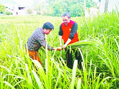 ③廣西平果縣太平鎮(zhèn)吉林村第一書記劉啟強(qiáng)(右一)幫助群眾收割牛草。