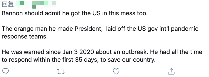 “班農(nóng)應(yīng)該承認(rèn),他也讓美國(guó)陷入了混亂。他輔助的總統(tǒng),解散了美國(guó)政府的疫情應(yīng)對(duì)小組。自2020年1月3日起,他就被警告可能暴發(fā)疫情,他有足夠的時(shí)間在最初的35天內(nèi)做出反應(yīng),拯救我們的國(guó)家!薄