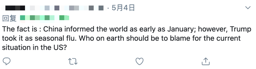 “事實(shí)是,中國(guó)早在一月份通報(bào)給了世界。然而,特朗普將其視為季節(jié)性流感。美國(guó)目前的局勢(shì)應(yīng)該歸咎于誰(shuí)?”↓↓↓