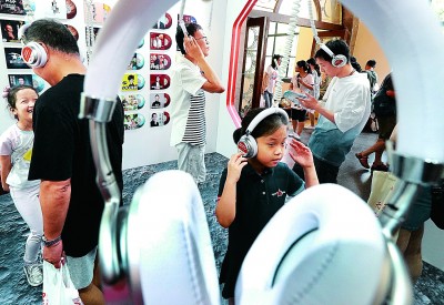 讀者在上海書(shū)展現(xiàn)場(chǎng)戴上耳機(jī)感受“聽(tīng)書(shū)”。 新華社發(fā)