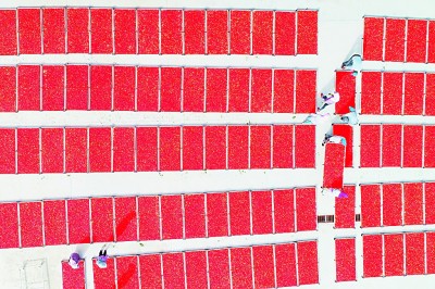 紅寺堡區(qū)紅寺堡鎮(zhèn)光彩村村民晾曬枸杞。 丁半農(nóng)攝