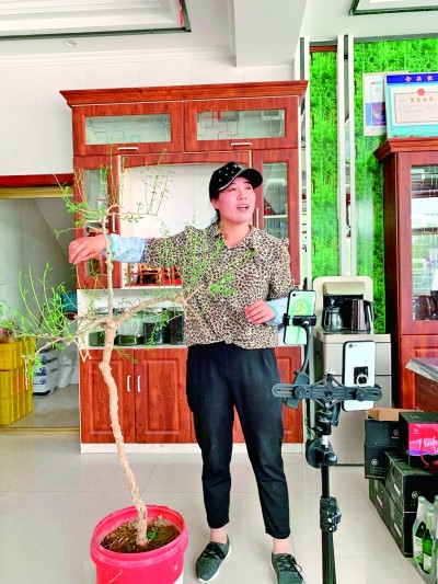 王航弟在家里放了一盆枸杞盆栽,以方便在直播時向一些沒見過枸杞樹的顧客展示。光明日報記者 王建宏攝