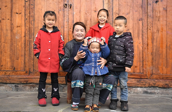 這是4月24日拍攝的吳美金(左二)和她孫子孫女的合影。1967年出生的吳美金,1992年嫁入飛蟲村(現(xiàn)十八洞村飛蟲寨)時,只有爛泥路的飛蟲村不僅田土少,掙錢活路也少,生活十分困難。2014年,吳美金加入了十八洞村苗繡特產(chǎn)農(nóng)民專業(yè)合作社,從小就會的苗繡傳統(tǒng)手藝如今成了家庭增收的法寶,不僅在家門口就把錢掙了,同時還能照顧年幼的孫子孫女。“現(xiàn)在的日子,比年輕的時候好多了!眳敲澜鹫f。新華社記者 薛宇舸 攝