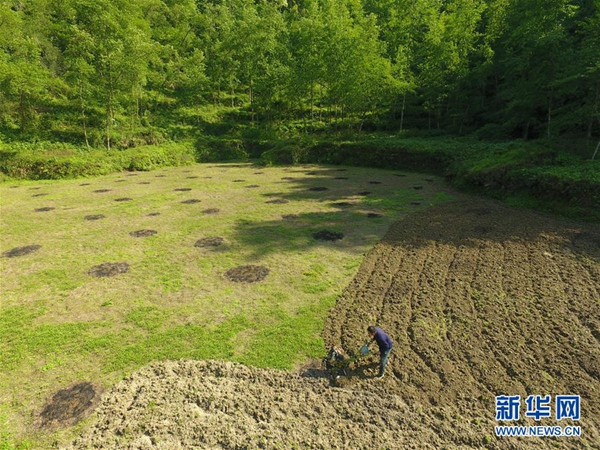 施六金在田間翻耕,為種水稻、養(yǎng)稻花魚作準(zhǔn)備(4月24日無人機拍攝)。1973年出生于十八洞村的施六金,由于父親患病很早就放棄學(xué)業(yè)和母親扛起了家庭的重?fù)?dān)。為了生活,他還曾遠(yuǎn)去東南亞打工。2015年,看到家鄉(xiāng)的變化,施六金回到村里開起了農(nóng)家樂,年度家庭人均純收入也從2014年的1715元增長到了2019年的35696元。2018年,施六金與心愛的人組建了家庭。今年初,施六金與愛人迎來了一個大胖小子!白鋈俗鍪乱没貓蠛透卸。”施六金給剛出生的兒子取名施澤恩。新華社記者 薛宇舸 攝