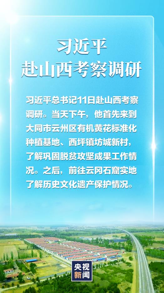 習(xí)近平總書記11日赴山西考察調(diào)研。當(dāng)天下午,他首先來(lái)到大同市云州區(qū)有機(jī)黃花標(biāo)準(zhǔn)化種植基地、西坪鎮(zhèn)坊城新村,了解鞏固脫貧攻堅(jiān)成果工作情況。之后,前往云岡石窟實(shí)地了解歷史文化遺產(chǎn)保護(hù)情況。