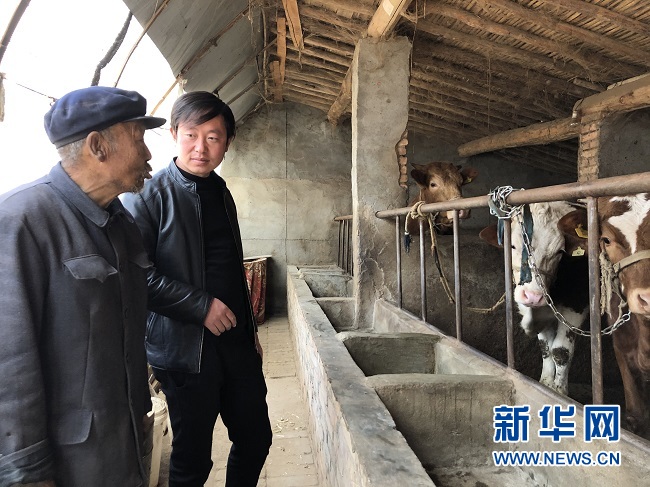 馬金龍(右一)和徐萬余在牛棚中拉家常。新華網(wǎng)發(fā)(張文靜 攝)