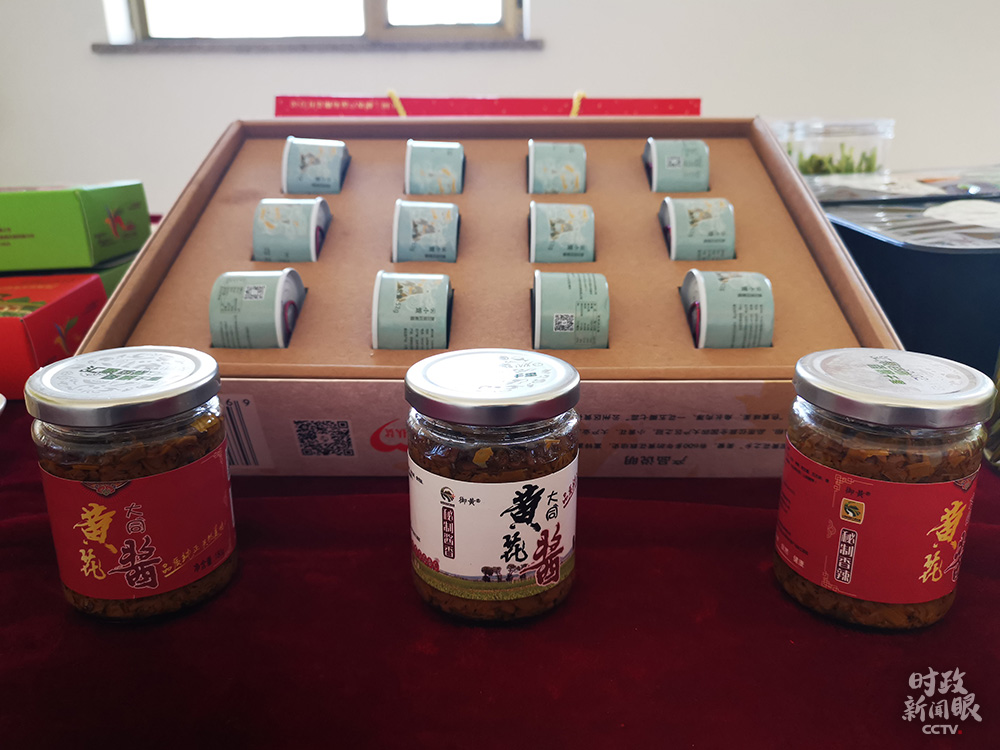 △以黃花為原材料制作的黃花餅、黃花醬、真空凍干黃花。(總臺(tái)央視記者張曉鵬拍攝)