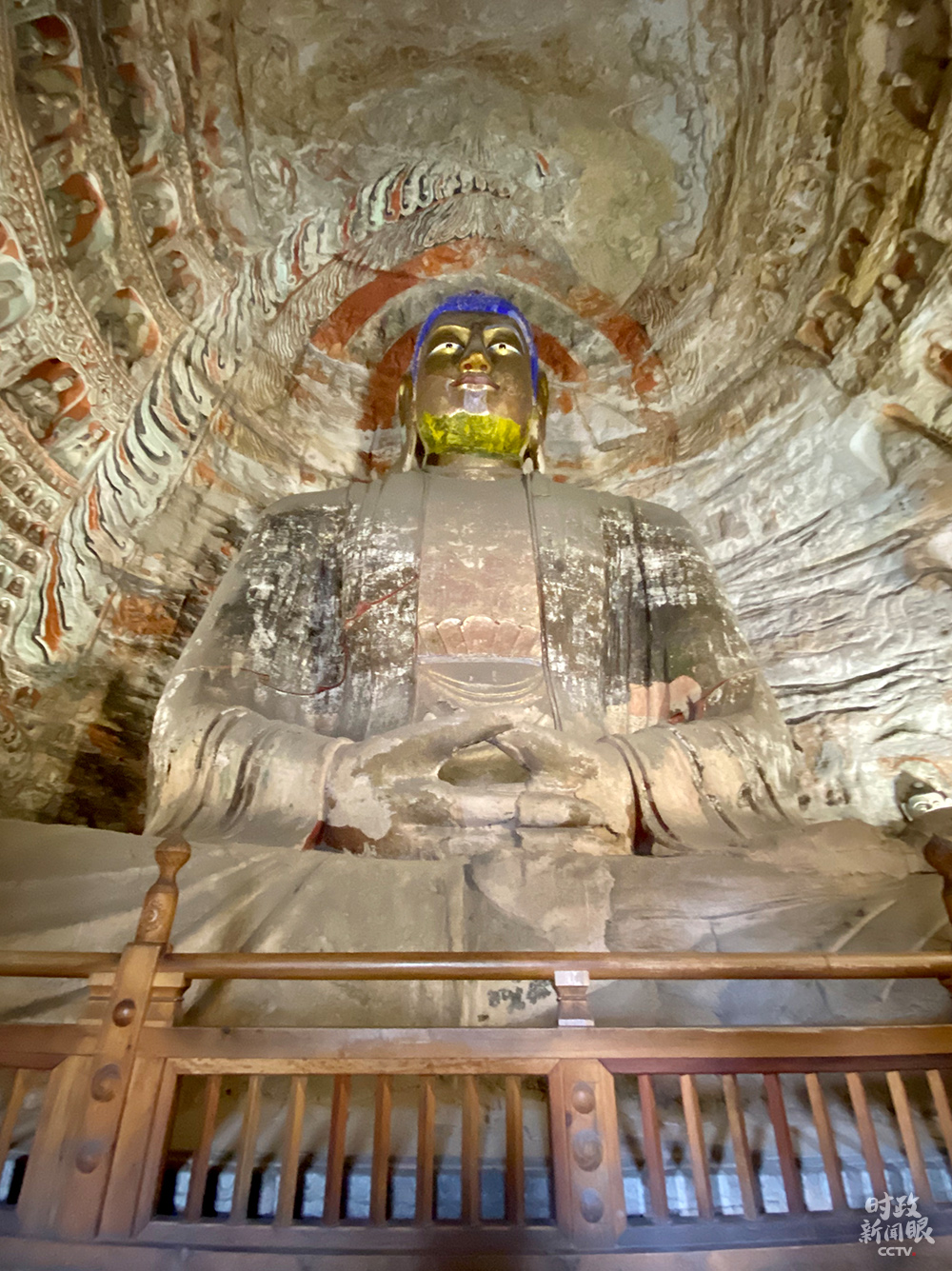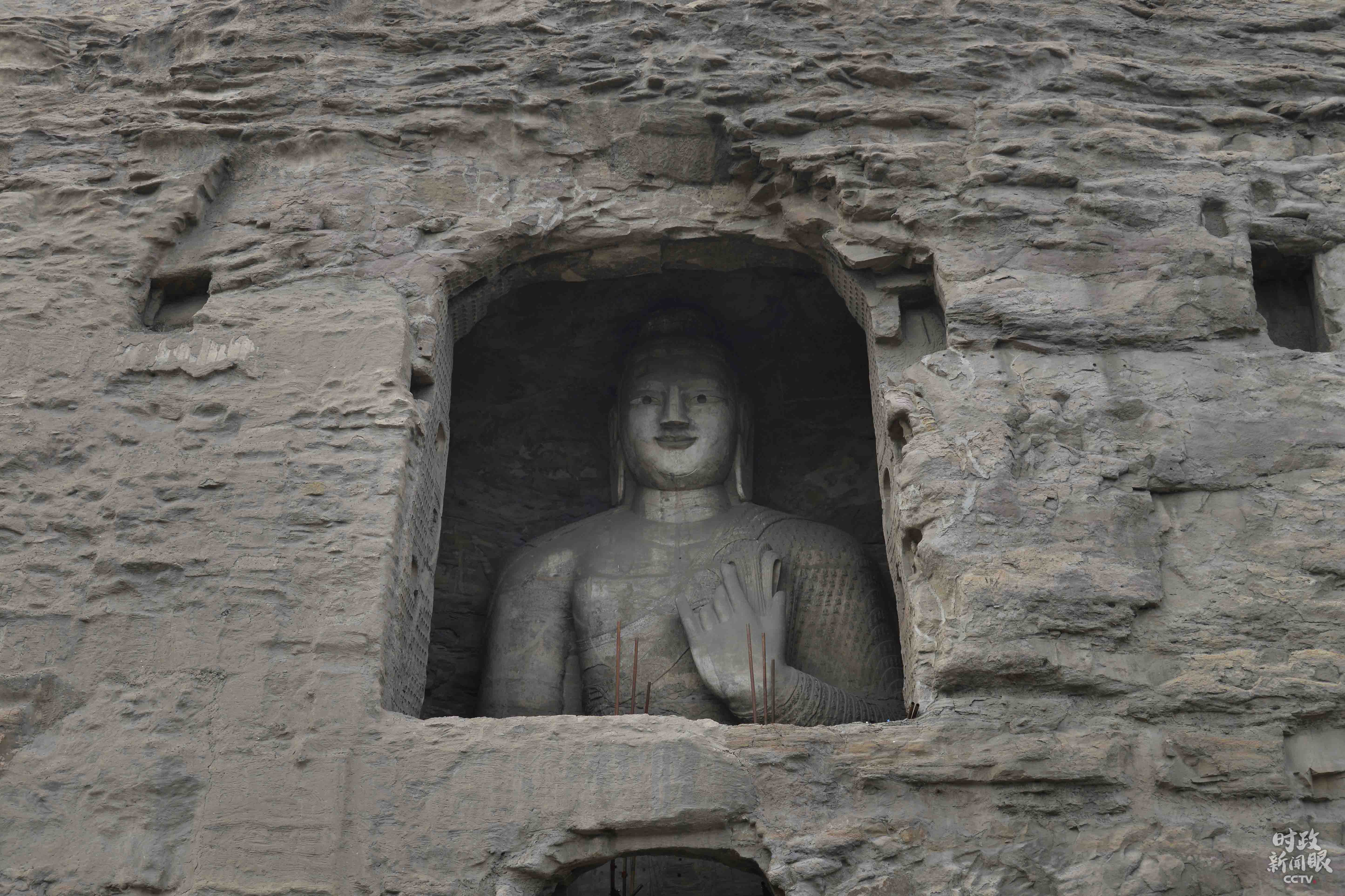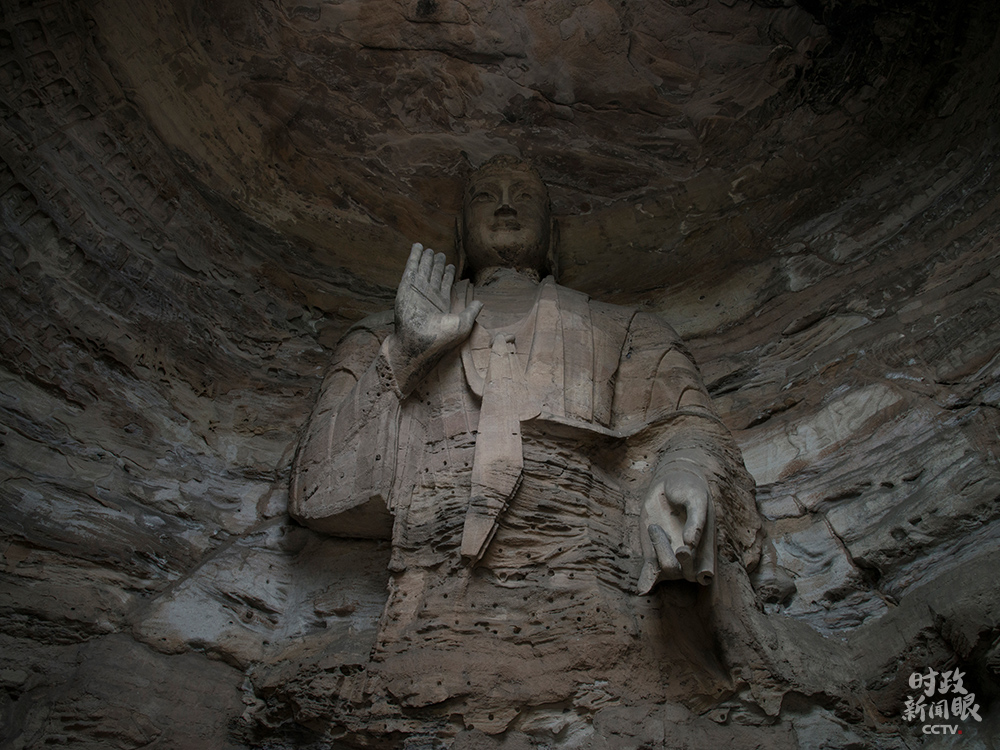 △第3窟是云岡最大的洞窟,又名“靈巖寺”,屬于中期石窟。主尊阿彌陀佛高10米。(總臺(tái)央視記者李輝拍攝)