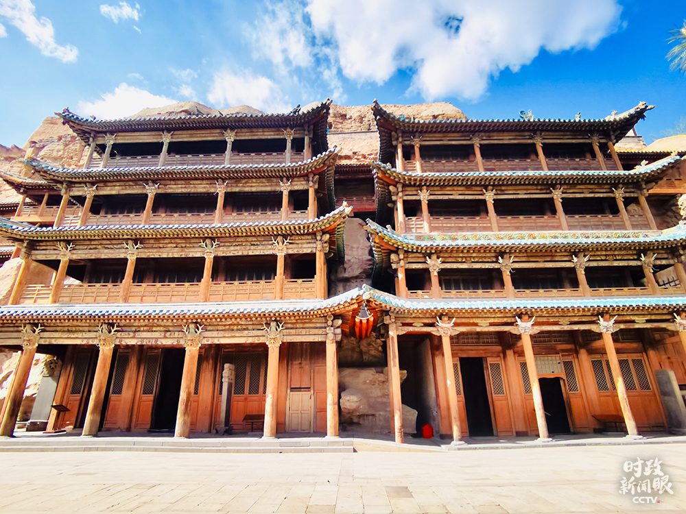 △第5、6窟是工程浩大、雕飾華麗的典型洞窟。窟前四層木質(zhì)樓閣為清順治八年(1651年)所建。第5窟主像是云岡石窟第一大佛,坐佛高17米。(總臺(tái)央視記者李輝、楊波拍攝)