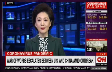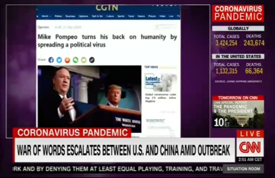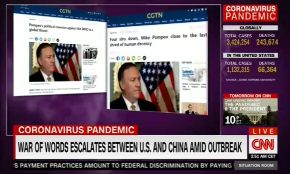 美國(guó)有線電視新聞網(wǎng)國(guó)內(nèi)頻道(CNN)和美國(guó)有線電視新聞網(wǎng)國(guó)際新聞?lì)l道(CNN International)僅5月1日至3日就連續(xù)三天共九次報(bào)道稱,本周中國(guó)中央電視臺(tái)幾乎每天播發(fā)評(píng)論抨擊美國(guó)國(guó)務(wù)卿蓬佩奧對(duì)中國(guó)的指責(zé),其中有一篇評(píng)論指出,“散播‘政治病毒’的蓬佩奧正把自己變成人類公敵!