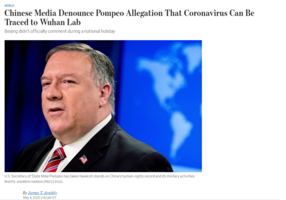 美國(guó)《華爾街日?qǐng)?bào)》網(wǎng)站5月4日刊發(fā)文章稱,美國(guó)國(guó)務(wù)卿蓬佩奧變本加厲地指控新冠病毒疫情可以追溯至中國(guó)的實(shí)驗(yàn)室,引發(fā)中國(guó)媒體憤怒回應(yīng)。
