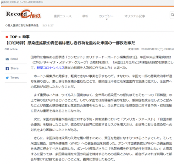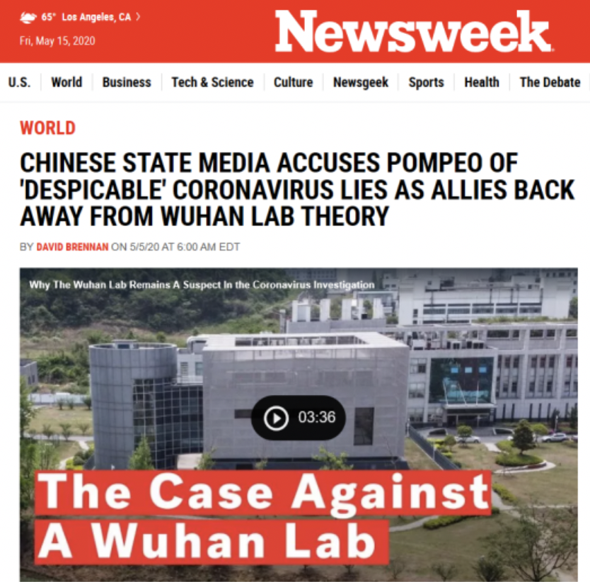 美國(guó)《新聞周刊》網(wǎng)站5月5日發(fā)表題為《中國(guó)官方媒體指責(zé)蓬佩奧“卑鄙的”冠狀病謊言》的報(bào)道。報(bào)道稱,蓬佩奧聲稱看到“大量證據(jù)”證明該病毒與疫情有關(guān),中國(guó)國(guó)家媒體憤怒回應(yīng)了針對(duì)該國(guó)應(yīng)對(duì)疫情不力以及武漢病毒研究所與疫情有關(guān)的指控。