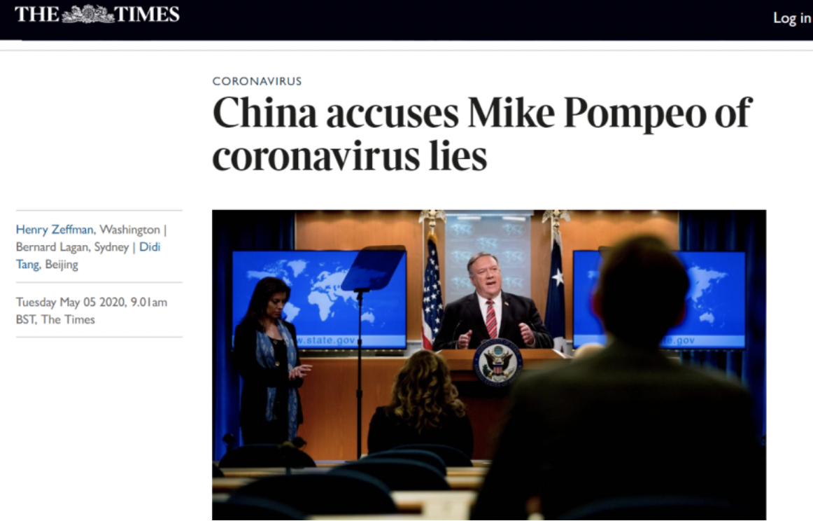 英國(guó)《泰晤士報(bào)》5月5日發(fā)表題為《中國(guó)指責(zé)蓬佩奧有關(guān)新冠病毒的謊言》的報(bào)道稱:“中國(guó)指責(zé)蓬佩奧有關(guān)新冠病毒的謊言。中央電視臺(tái)指責(zé)蓬佩奧用‘神經(jīng)錯(cuò)亂的說辭’在‘噴毒造謠’!