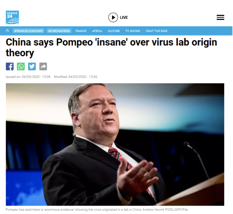 法國(guó)24電視臺(tái)英語新聞?lì)l道(France 24 English)和法國(guó)24電視臺(tái)西語新聞?lì)l道(France 24 Espanol)5月5日引用《新聞聯(lián)播》中關(guān)于《病急亂投醫(yī)!邪惡蓬佩奧在科學(xué)面前大肆噴毒造謠》的報(bào)道。報(bào)道稱,中國(guó)指出,美國(guó)部分政客的言論說明其已經(jīng)“病急亂投醫(yī)”,急于“甩鍋”。