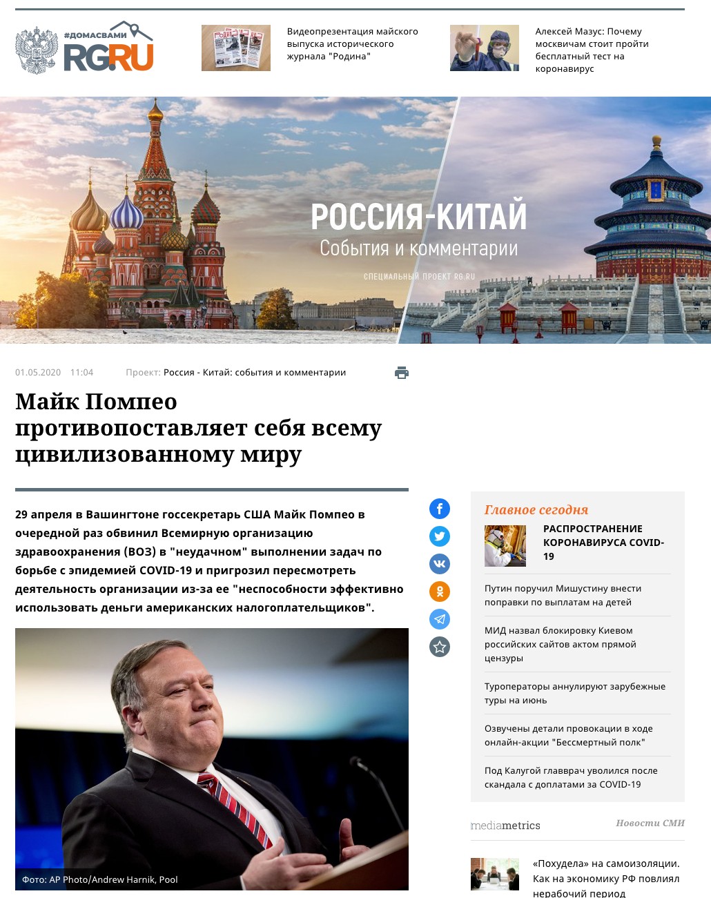 俄羅斯最具權(quán)威性和影響力的國(guó)家政府機(jī)關(guān)報(bào)《俄羅斯報(bào)》官網(wǎng)5月1日發(fā)表題為《蓬佩奧與全世界對(duì)抗》的文章。文章稱,在美國(guó)疫情確診人數(shù)突破百萬的危急時(shí)刻,蓬佩奧不是集中精力為搶救美國(guó)公民生命而奔波,而是企圖對(duì)世衛(wèi)組織搞政治脅迫,公然站到了全世界的對(duì)立面。
