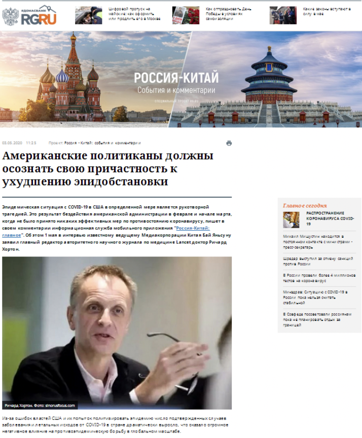 5月3日,《俄羅斯報(bào)》官網(wǎng)刊發(fā)題為《美國(guó)政客應(yīng)為全球疫情擴(kuò)散負(fù)責(zé)》的文章。文章稱,團(tuán)結(jié)和合作是應(yīng)對(duì)疫情的最有力武器。如果美國(guó)某些政客罔顧這一科學(xué)規(guī)律,那么必將淪為歷史的罪人。