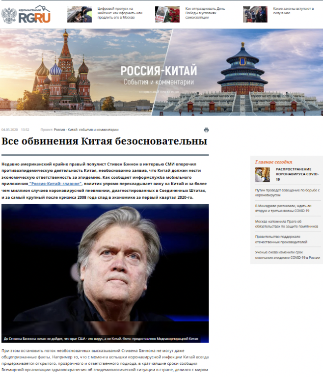 《俄羅斯報(bào)》官網(wǎng)5月4日發(fā)表題為《所有針對(duì)中國(guó)的指責(zé)都毫無根據(jù)》的文章稱,美國(guó)極右民粹分子史蒂夫·班農(nóng)在接受媒體采訪時(shí)詆毀中國(guó)抗疫模式,妄稱中國(guó)要對(duì)這場(chǎng)流行病承擔(dān)經(jīng)濟(jì)責(zé)任。在美國(guó)新冠肺炎確診病例突破百萬、一季度經(jīng)濟(jì)創(chuàng)國(guó)際金融危機(jī)以來最大跌幅背景下,班農(nóng)將責(zé)任歸咎中國(guó),毫無道德廉恥。