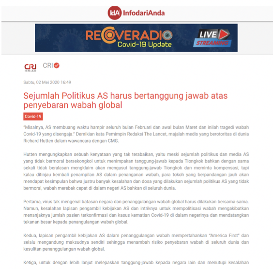 △印度尼西亞艾爾辛達(dá)電臺(tái)網(wǎng)站刊文