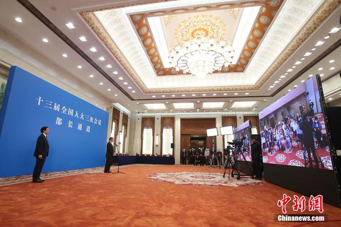 5月22日,第十三屆全國人民代表大會第三次會議在北京人民大會堂舉行首場“部長通道”采訪活動。圖為國家發(fā)展和改革委員會主任何立峰通過網(wǎng)絡(luò)視頻方式接受采訪。 中新社記者 韓海丹 攝