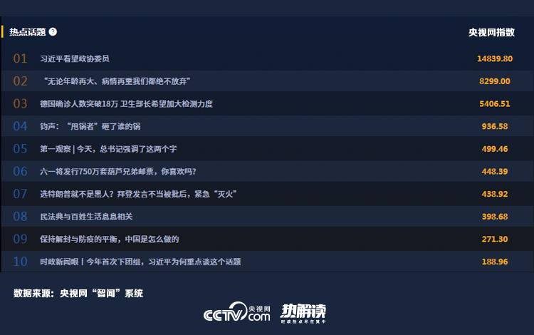 據(jù)央視網(wǎng)“智聞”系統(tǒng)“央視網(wǎng)指數(shù)”熱度顯示,23日下午,總書記參加經(jīng)濟(jì)界委員聯(lián)組會(huì)的新聞迅速高居榜首。