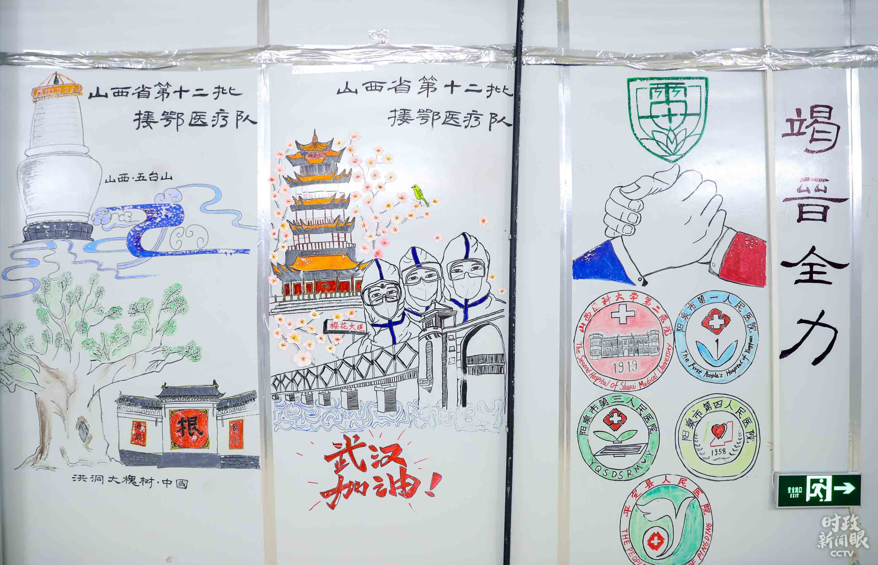 △4月14日,武漢雷神山醫(yī)院實(shí)現(xiàn)患者“清零”。這是走廊上山西援鄂醫(yī)療隊(duì)留下的手繪作品,滿懷對(duì)武漢的祝福。