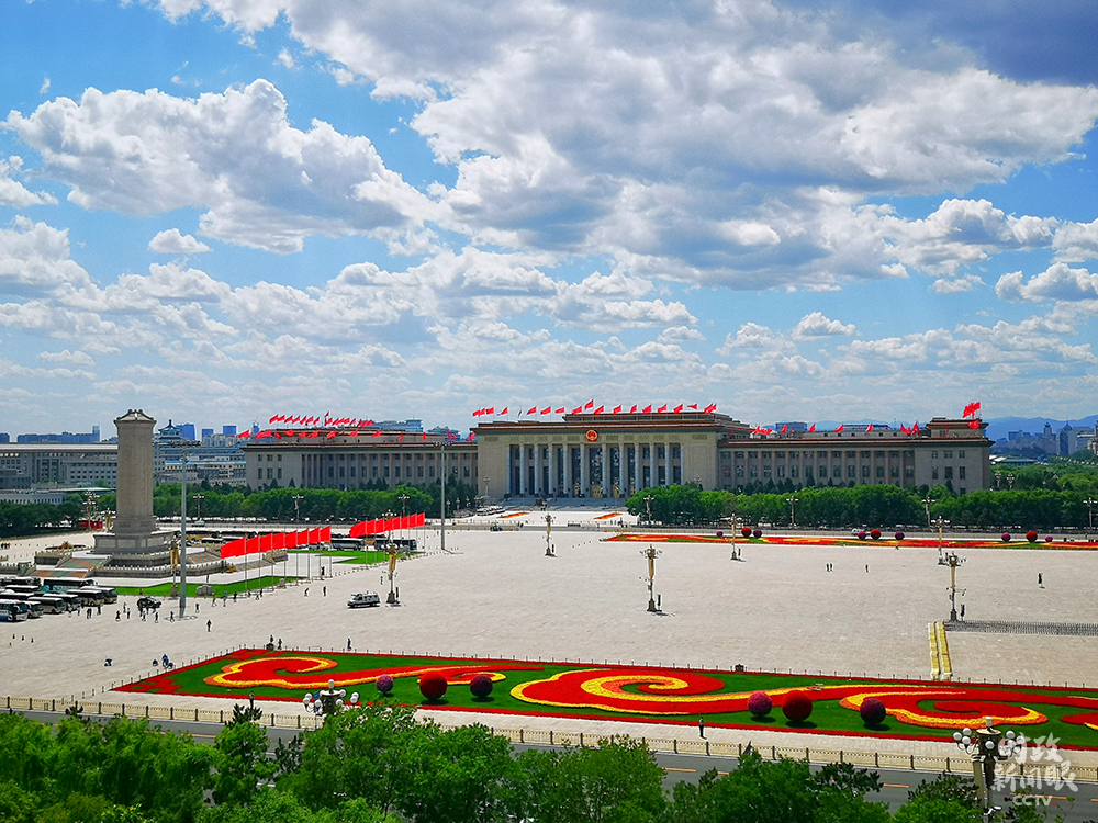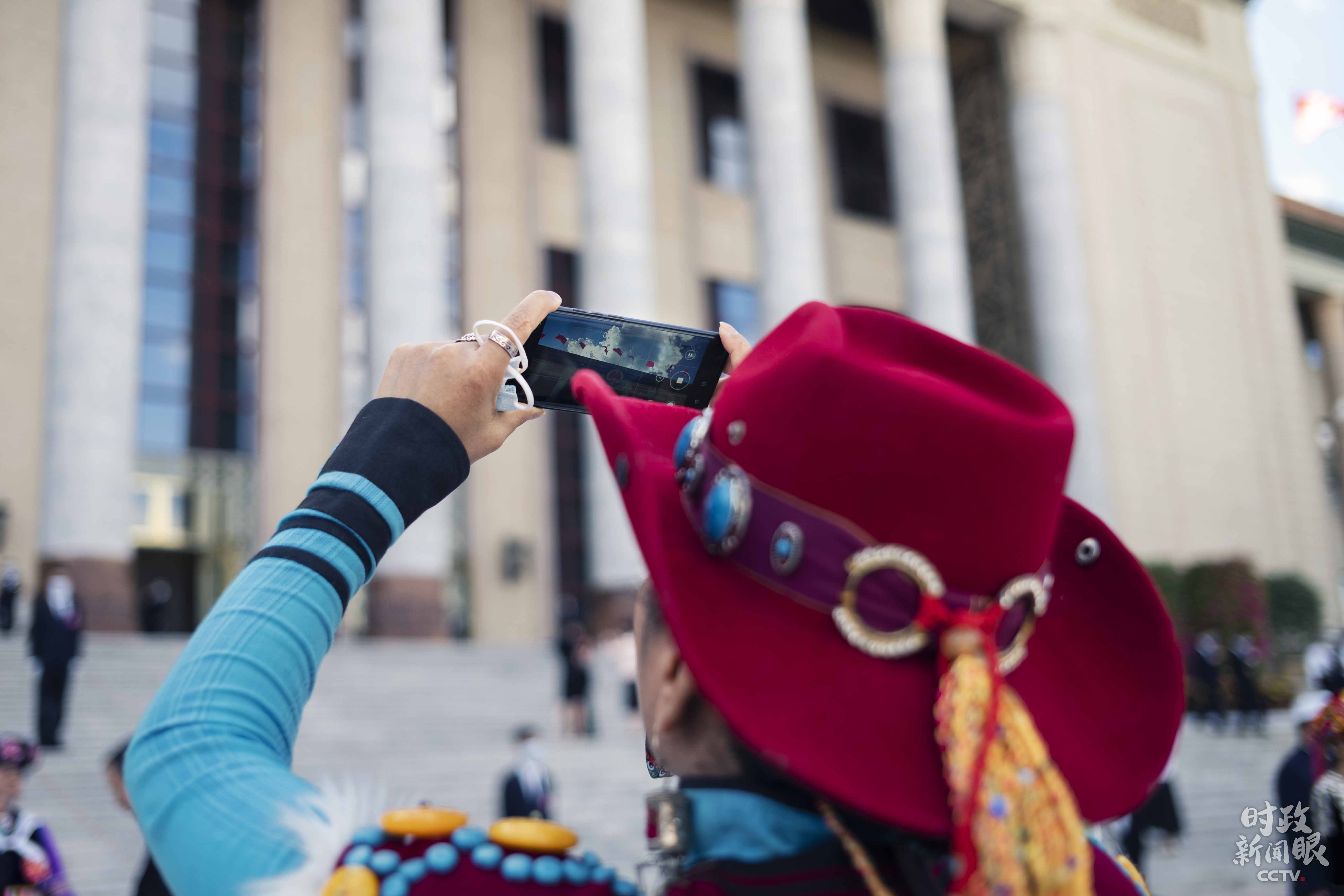 △一位政協(xié)委員用手機(jī)記錄下大會(huì)堂樓頂紅旗迎風(fēng)招展的一刻。(總臺(tái)央廣記者潘毅、央視記者王哈男拍攝)