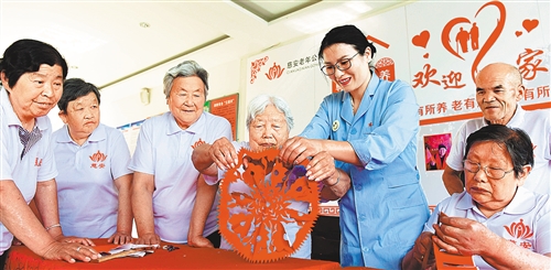 在河北省邢臺(tái)市威縣章臺(tái)鎮(zhèn)一家養(yǎng)老院,院長(zhǎng)楊瑞美和老人一起剪窗花。 朱旭東攝(新華社發(fā))